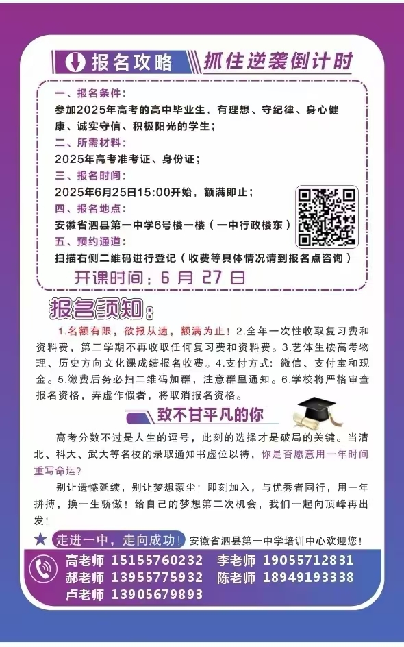 重燃理想,逐梦新程泗县第一中学培训中心复读班招生公告一、报名条件:参加2...